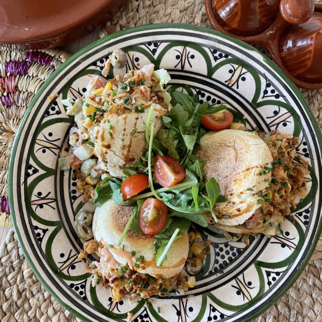 Tajine met scampi in tomatensaus en ei, olijven, Marokkaans brood, boter, smeerkaas, honing harsha, msemen, beghrir, confituur, amlou, yoghurt met granola, koffie of thee, verse sinaasappelsap